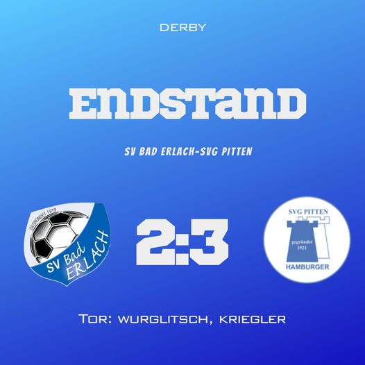 Jede Serie reißt einmal - unsere leider sehr bitter gegen Pitten. In den letzten Sekunden des Spiels bekommen wir den Treffer zum 2:3. Zum Anpfiff kommt es danach nicht mehr. Nach überlegener ersten Halbzeit und 2:0 Führung läuft in der zweiten Halbzeit alles gegen unsere Mannschaft aus Erlach. Ein verletzungsbedingter bedingter Wechsel von Samuel Manninger und der Ausschluss von Filip Alilovic haben unserer Mannschaft erwartungsgemäß geschwächt. Ein 2:2 mit dem augenscheinlich beide Mannschaften leben konnten sollte es werden, doch am Ende kam dann leider doch alles anders. Nach überzogener Nachspielzeit durch den Schiedsrichter und einem letzten Eckball drückt Pitten den Ball zum 2:3 über die Linie und das Spiel ist zu Ende. Wir nehmen aus diesem Spiel eine tolle erste Halbzeit und den Lerneffekt für die kommenden Aufgaben mit. Wir gratulieren unserer U23 zum Sieg im kleinen Derby und schauen bereits aus den nächsten Gradmesser Scheiblinkirchen II nächsten Sonntag.