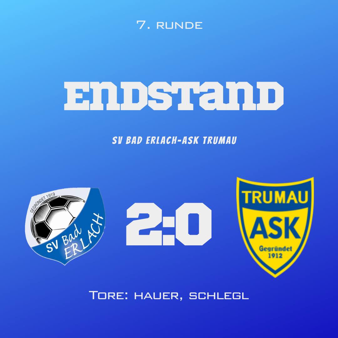 7. Runde - wir stehen in der Halbzeit der Hinrunde und das bisweilen ganz passabel. Die erste Halbzeit endet gegen ein defensives Trumau mit 0:0. Doch in der zweiten Halbzeit schlagen wir nach einer identen Aktion wie in der ersten Halbzeit zu. Wurglitsch schießt den Freistoß aus dem rechten Mittelfeld lang in den 16er, wo Maximilian Werner Hauer wieder lauert. Der Innenverteidiger lässt sich die zweite Chance, nachdem er in der 1. Halbzeit knapp am Tor vorbeigesetzt hatte, nicht entgehen und netzt volley zum umjubelten 1:0. Bad Erlach bestimmt weiterhin das Spiel gegen harmlose Trumauer. Unsere Verteidigung lässt nichts mehr zu und wir machen sogar den "Lucky Punch" kurz vor dem Schlusspfiff. Niklas Schlegel darf sich nach Quervorlage von Kriegler über seinen ersten Bewerbstreffer für seinen Heimatverein in der Kampfmannschaft freuen. Wir gratulieren zur Leistung und der nun bereits seit 5 Spielen anhaltenden ungeschlagenen Serie. Auch die U23 darf sich nach einem knappen 2:1 über den vierten Sieg in der laufenden Saison freuen. Die nächste Runde bringt uns am 03.10. auswärts nach Leobersdorf.