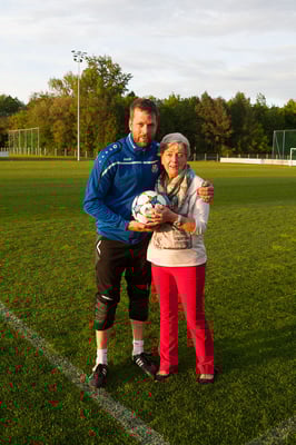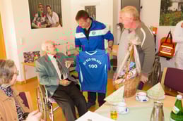 Ein ganz besonderes Geschenk überbrachte Obmann Andreas Freihammer: Hoch erfreut nahm Herr Darabos ein Trikot des SV Bad Erlach mit der Nummer 100 entgegen. Beim anschließenden Kaffee und Kuchen saß man gemütlich beisammen und tauschte Erinnerungen aus. Ganz einfach war das Leben von Herrn Darabos nicht, musste er doch den 2. Weltkrieg vom ersten Tage an mitmachen und geriet gegen Kriegsende sogar in russische Gefangenschaft, aus der er 1946 zurückkehrte. Er übernahm die 1956 Tischlerei seines Vaters, die er 1976 an seinen Sohn weiter gab. An seine Zeit als Funktionär für den SV Bad Erlach erinnert sich Herr Darabos auch heute noch sehr gerne!